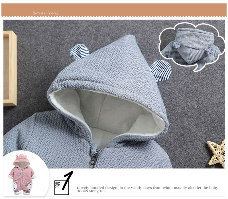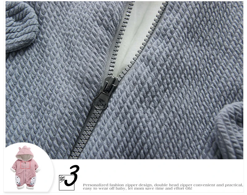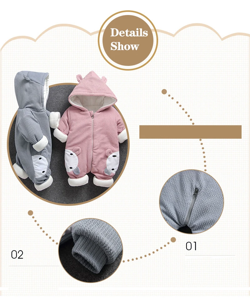 Adorable and durable, this Baby Romper in light pink or grey makes the ultimate style this winter. A cute combination of a romper and cute animal print. This style boasts complete coverage and comfort. The attached hood leads to keeping your baby's head protected and warm whereas the full-length front zip allows for easy diaper changes.