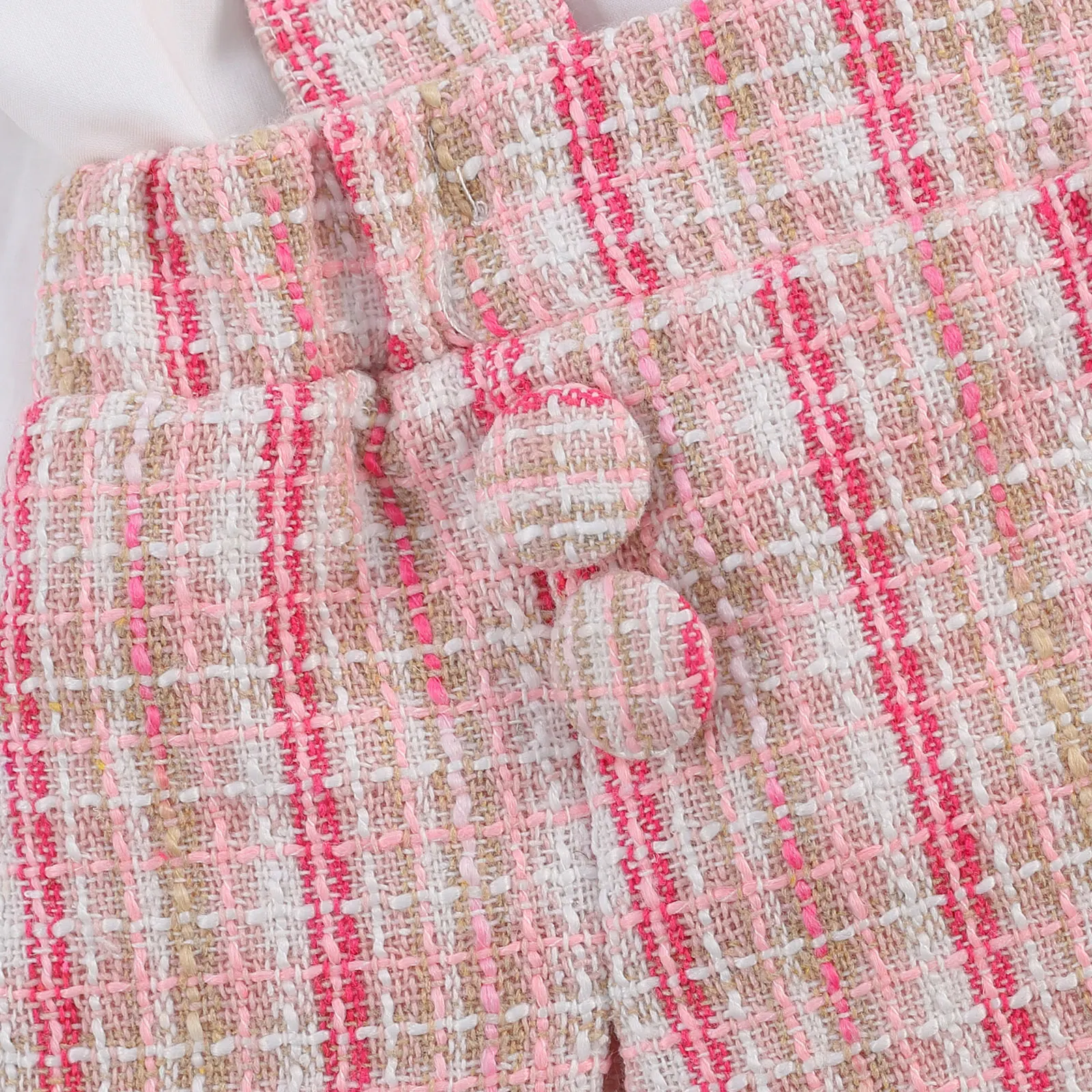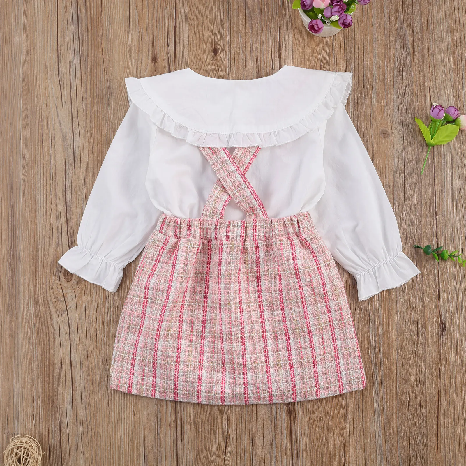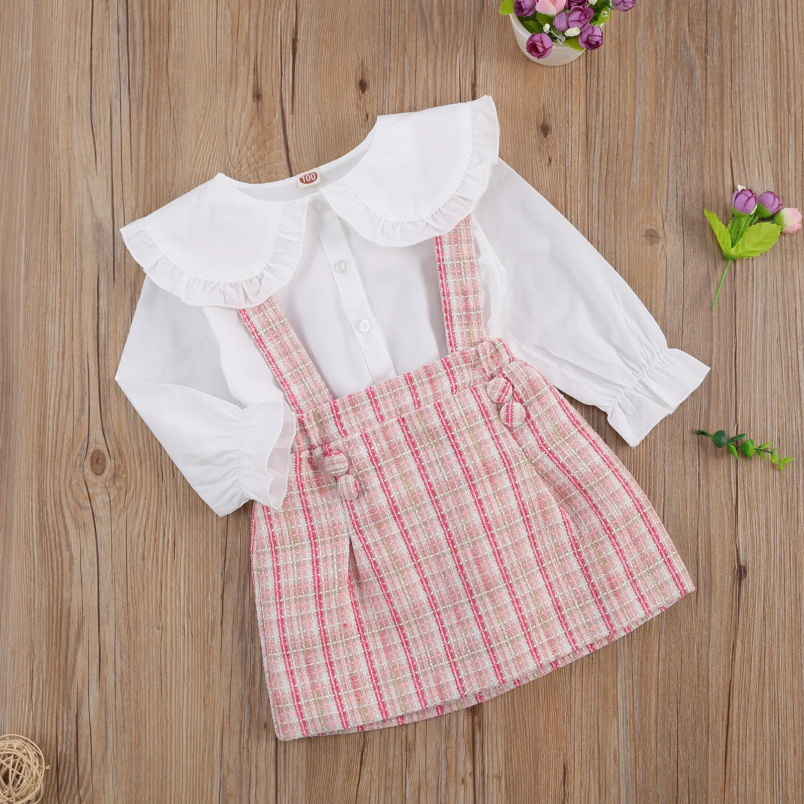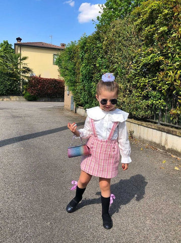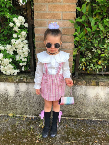 Update your little one's wardrobe with this peter pan collar outfit. This chic peter pan lace collar fastens up with front buttons down and elastic frilled cuffs. Comes in a set of suspender skirt. The skirt features a cotton blend composition and supportive shoulder straps for added versatility and styling.